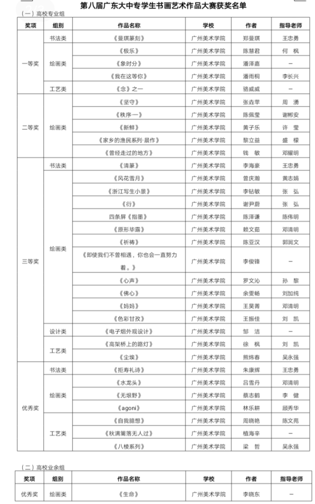 近日,由共青团广东省委员会、广东省教育厅、广东省文化和旅游厅、广东省体育局、广东省学生联合会共同主办的“青春筑梦,灯塔引航——第十三届广东大中专学生校园文体艺术节”落下帷幕。在本届文体艺术节中我校表现优异,荣获“优秀组织奖”,在文体艺术节系列活动之“第八届广东大中专学生书画艺术作品大赛”中我校学生荣获一等奖5项、二等奖5项、三等奖15项、优秀奖8项。
