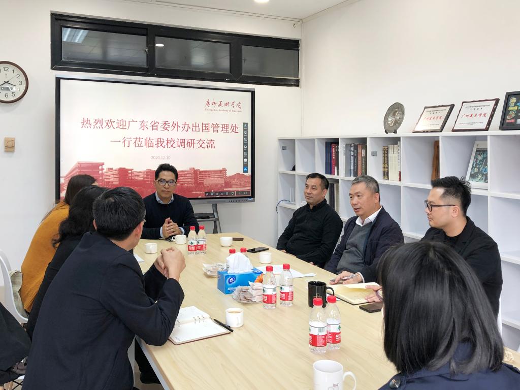 12月10日,广东省委外办出国管理处处长黄敏、调研员杨向阳等一行到我校调研交流因公出国管理工作。学校党委书记谢昌晶、党政办主任李金水、国际合作与交流处副处长伍端等人热情接待了黄敏一行,并在大学城校区进行座谈。