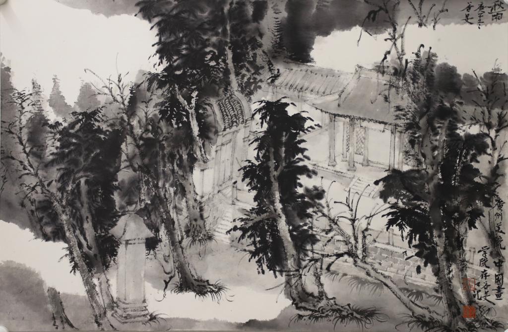 下午,张谷旻为师生们现场示范,创作了一幅《秋雨图》,他一边示范一边为同学们讲述创作思路,以及历代和近现代各家在表现同类物象时的处理方式,不同表现特点,并具体解析用笔用墨、经营位置的技巧等。