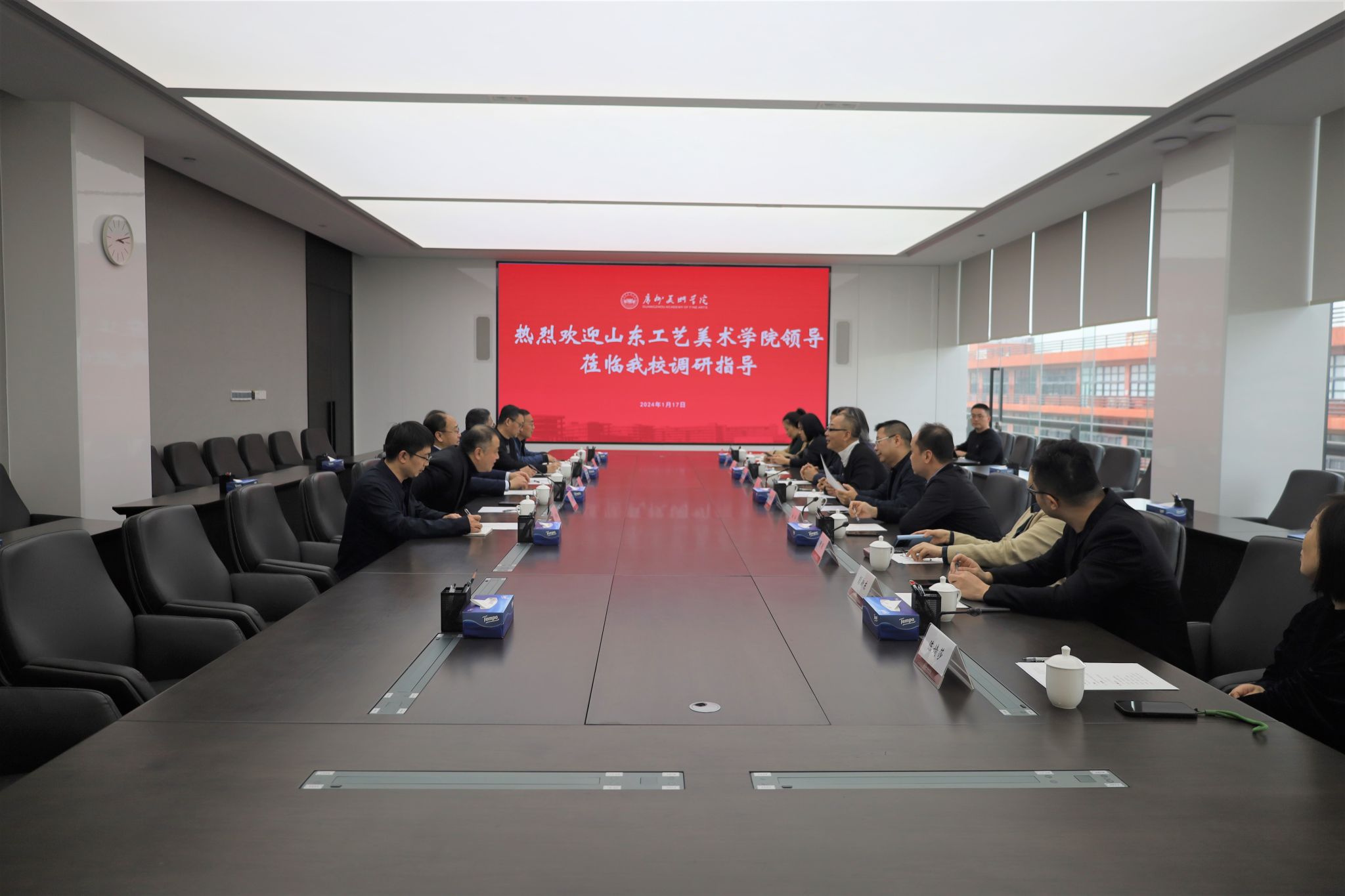 1月17日下午,山东工艺美术学院党委副书记、院长董占军一行到我校调研。我校党委书记林蓝,院长范勃,党委副书记宋光智,副院长蔡拥华,党政办公室、教务处、科研创作处、发展规划与学科建设办公室、人事处、研究生院负责人参加调研。