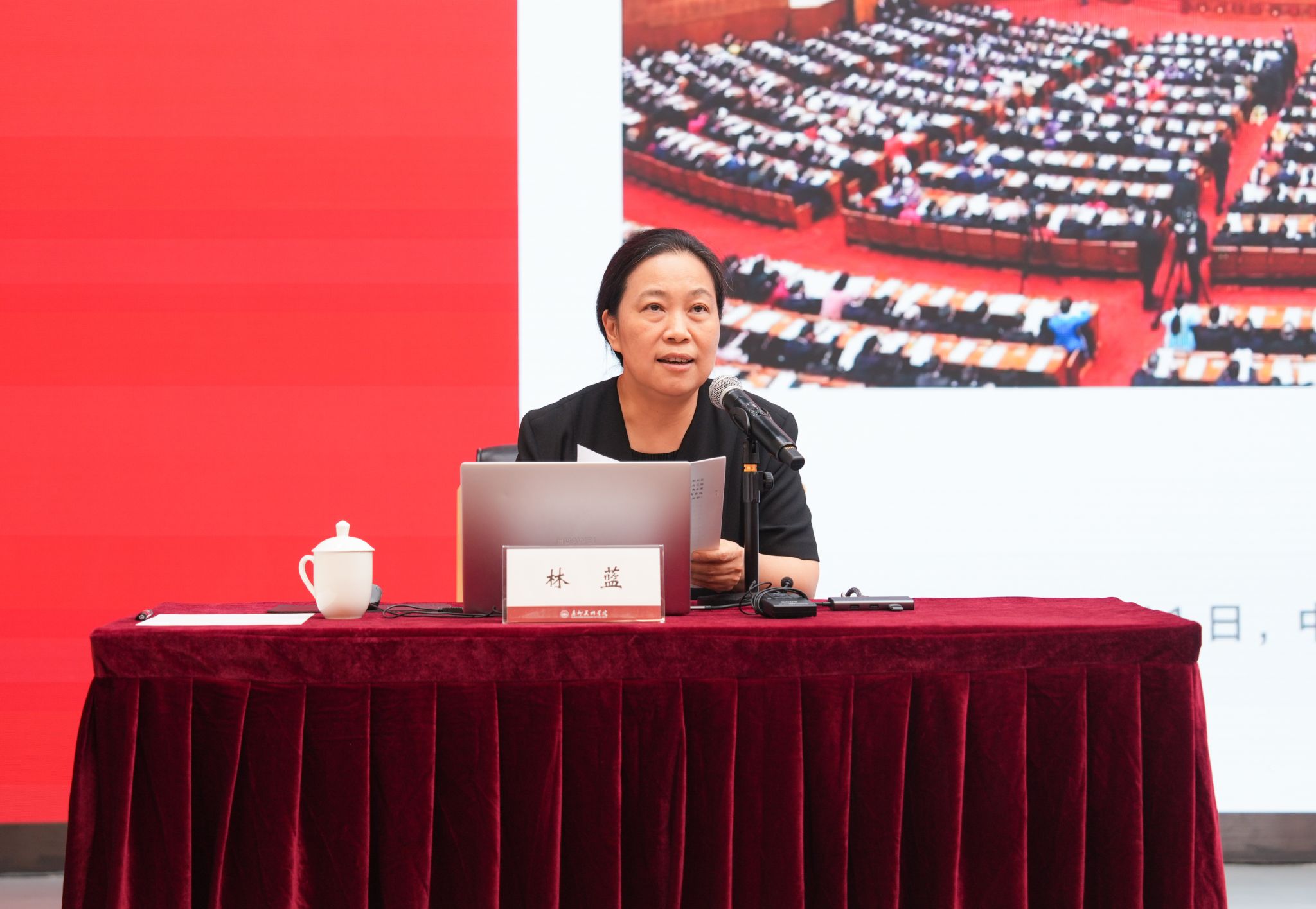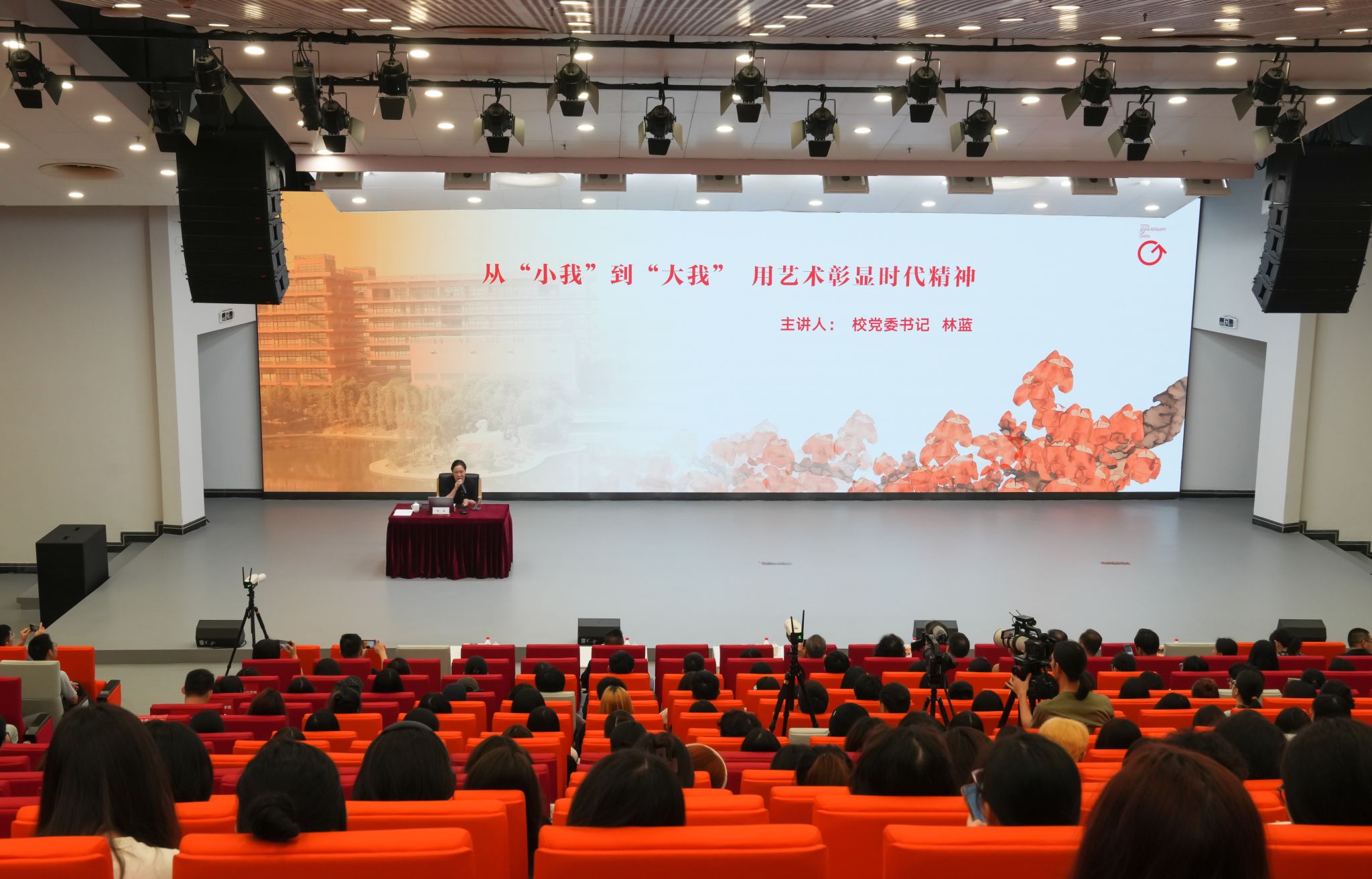 围绕学习贯彻习近平文化思想的主题,林蓝在讲课中回顾了我们党跨越70多年的两次文艺工作座谈会的重大意义和中国共产党领导文化建设的奋进历程。结合我校70多年的办学成果,用十三个美术经典,生动阐述了一代代广美人坚持以人民为中心的创作导向,守正创新,扎根生活,以精品记录时代、讴歌时代的生动实践。她勉励同学们,要传承弘扬广美优良传统,坚定理想信念,厚植家国情怀,增长本领才干,涵养进取品质,践行使命担当,追求艺术梦想,以奋斗姿态激扬青春,在推进强国建设、民族复兴的新征程中大展风采,实现人生价值。