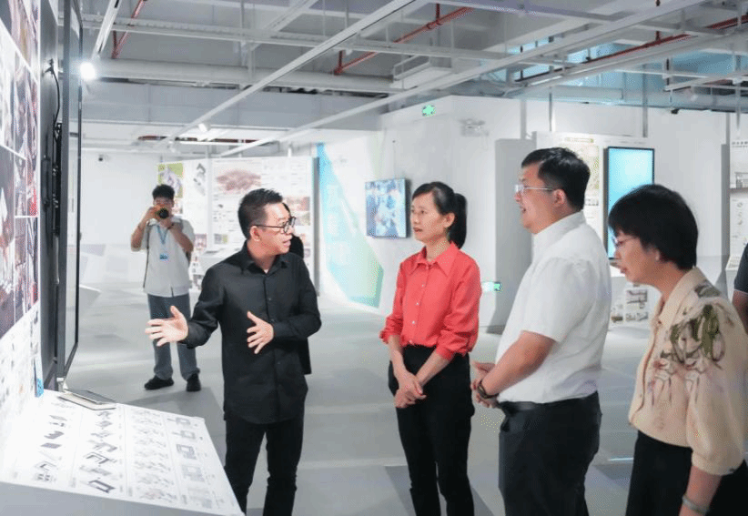 随后,庄灏一行参观了2024年本科毕业作品展城市学院展区。展区中,阳春市永宁镇横垌瑶族村是我校“双百行动”服务村,城市学院经过多次实地调研和反复提炼,为该村规划了五大篇章和十三个节点的设计方案,并在此次毕业展中以“瑶鼓相迎,千米画廊”为主题展出了设计模型、平面图和效果图。领导们认为成果具有创新性和可行性,将助力阳春市打造“粤西第一瑶寨”。同时他们也邀请城市学院赴阳春市进行设计成果展览,向更多人呈现一个民族风情与和谐生态的美丽瑶寨。