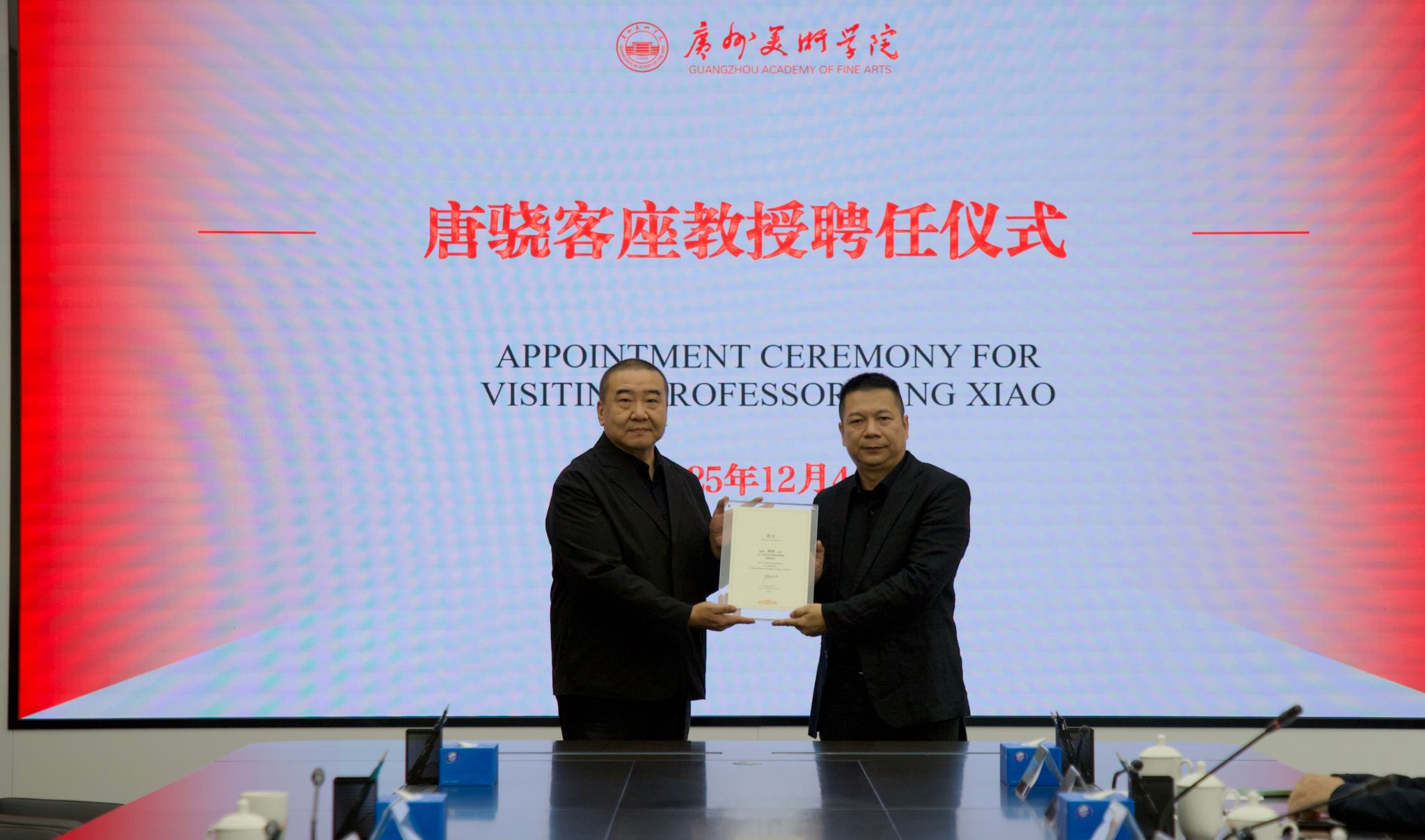 12月4日上午,我校在大学城校区举行唐骁客座教授聘任仪式。学校党委副书记宋光智,人力资源部部长王志强,绘画艺术学院党总支书记何周宇,绘画艺术学院院长郭祖昌,科研创作部副部长范久鹏,绘画艺术学院副书记伍慷、何卓雅,副院长刘可、胡贤武及教师代表出席了聘任仪式。宋光智为唐骁颁发客座教授聘书。郭祖昌主持聘任仪式。