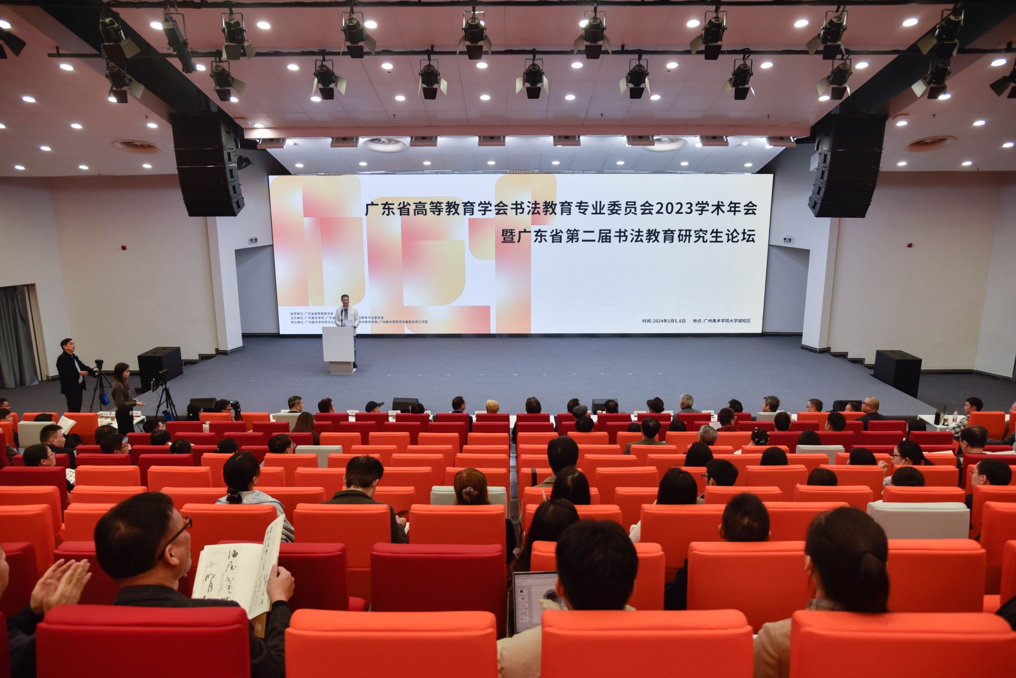 1月6日,广东省高等教育学会书法教育专业委员会2023学术年会暨广东省第二届书法教育研究生论坛在我校大学城校区举行。我校副院长蔡拥华出席会议,来自中山大学、暨南大学、华南师范大学、华南农业大学等20余所理事单位的80余位代表及60余位“首届岭南心学书法作品展”获奖作者代表参加会议。会议由我校副教授、广东省高等教育学会书法教育专业委员会秘书长洪权主持。