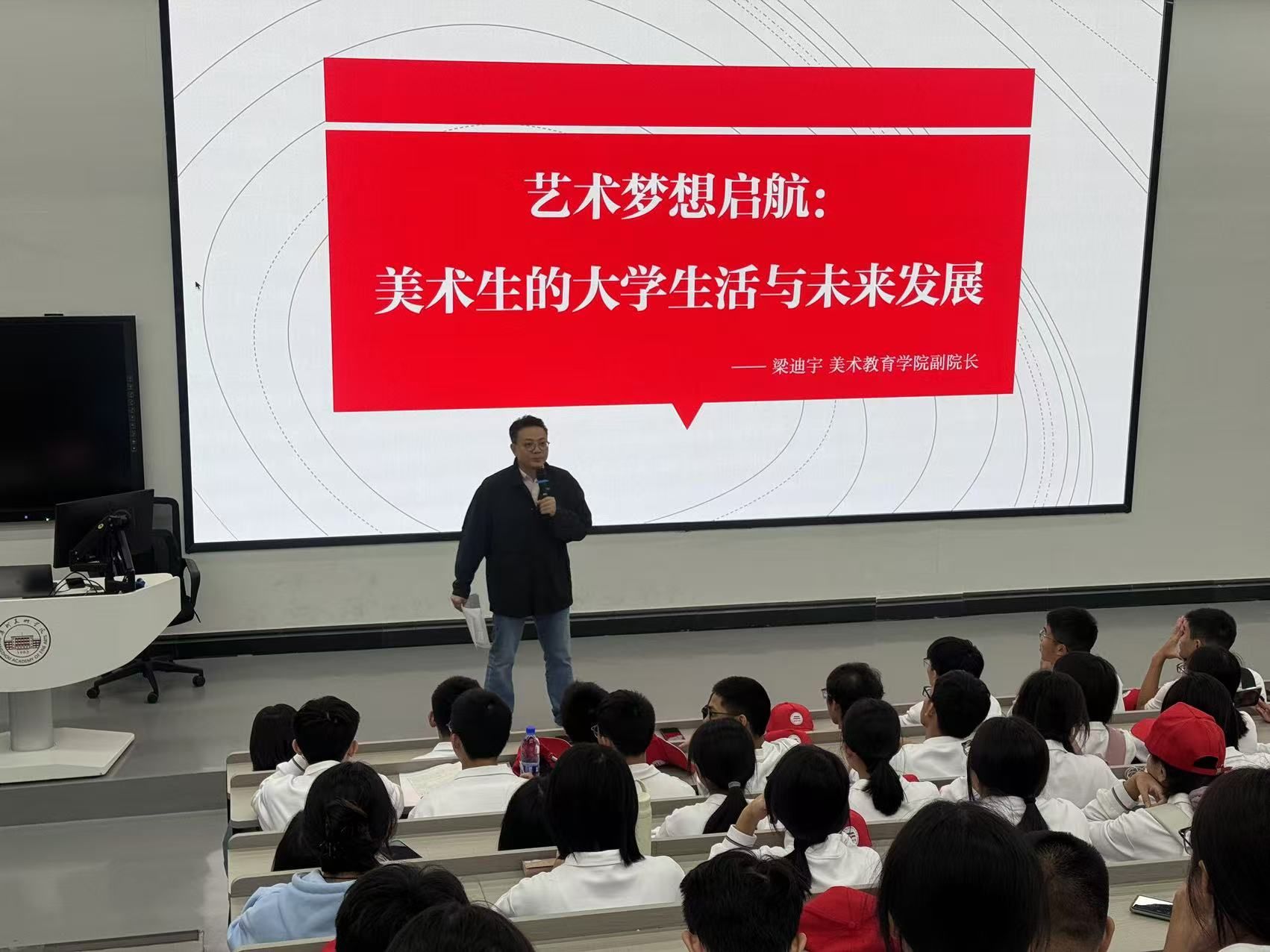 师生研学团首先来到学校美术馆观看展览。美术馆李铁军老师向大家简要介绍了相关展览的基本情况,帮助师生们从更广阔的艺术视野和审美角度进行观展。随后,师生研学团来到北阶梯教室参加美术专业学习规划讲座。美术教育学院副院长梁迪宇给大家带来了题为《艺术梦想起航:美术生的大学生活与未来发展》学习交流讲座,他耐心、细致且有针对性地为师生们答疑解惑,讲解生动活泼,现场反响热烈。