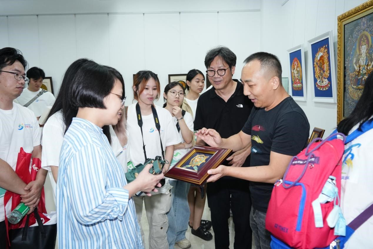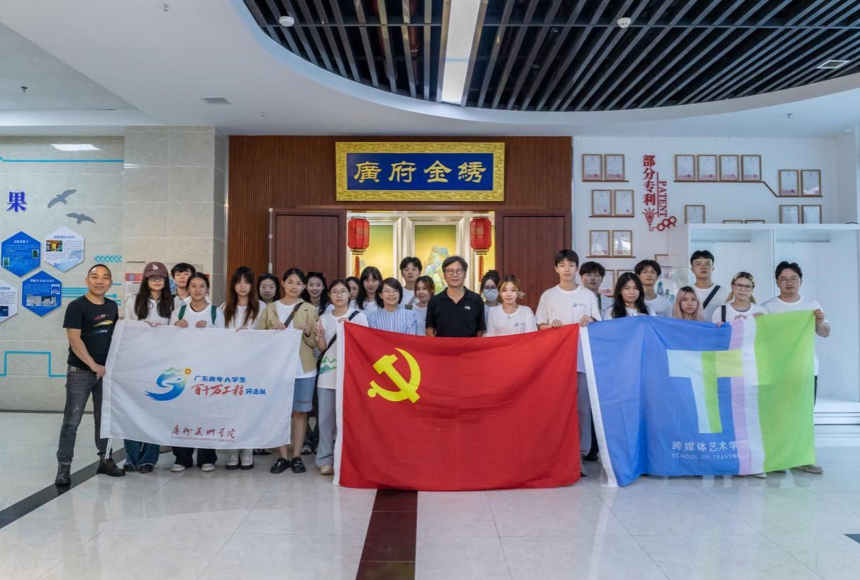 调研团队还前往中山进一步拓宽视野、学习先进经验。广府金绣工艺创始人胡荣奎带领师生参观了园区内的广府金绣文化创意项目。胡老师分享了将传统技艺与现代审美、市场需求相结合的成功实践,为学生们提供了宝贵的创作启发和实践参考。