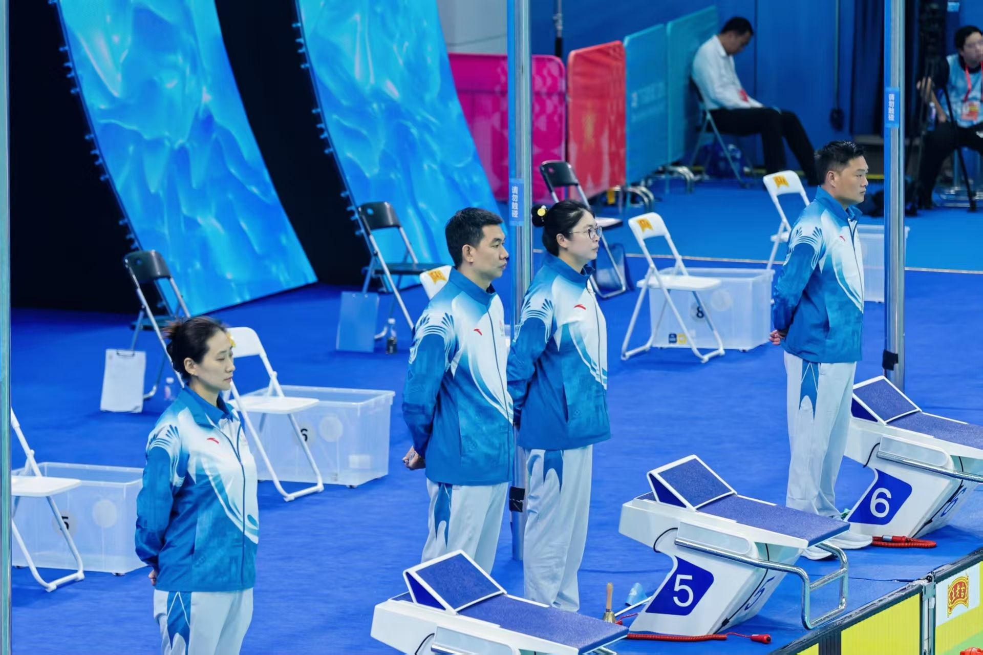 陈诚老师作为游泳国家级裁判,在本届全运会中担任游泳项目技术官员,深度参与赛事组织与裁判工作。他凭借良好的体育道德风尚和专业的裁判能力,通过高效沟通与协作,积极营造公平、公正的竞赛环境,为游泳赛事顺利举行提供了有力保障。