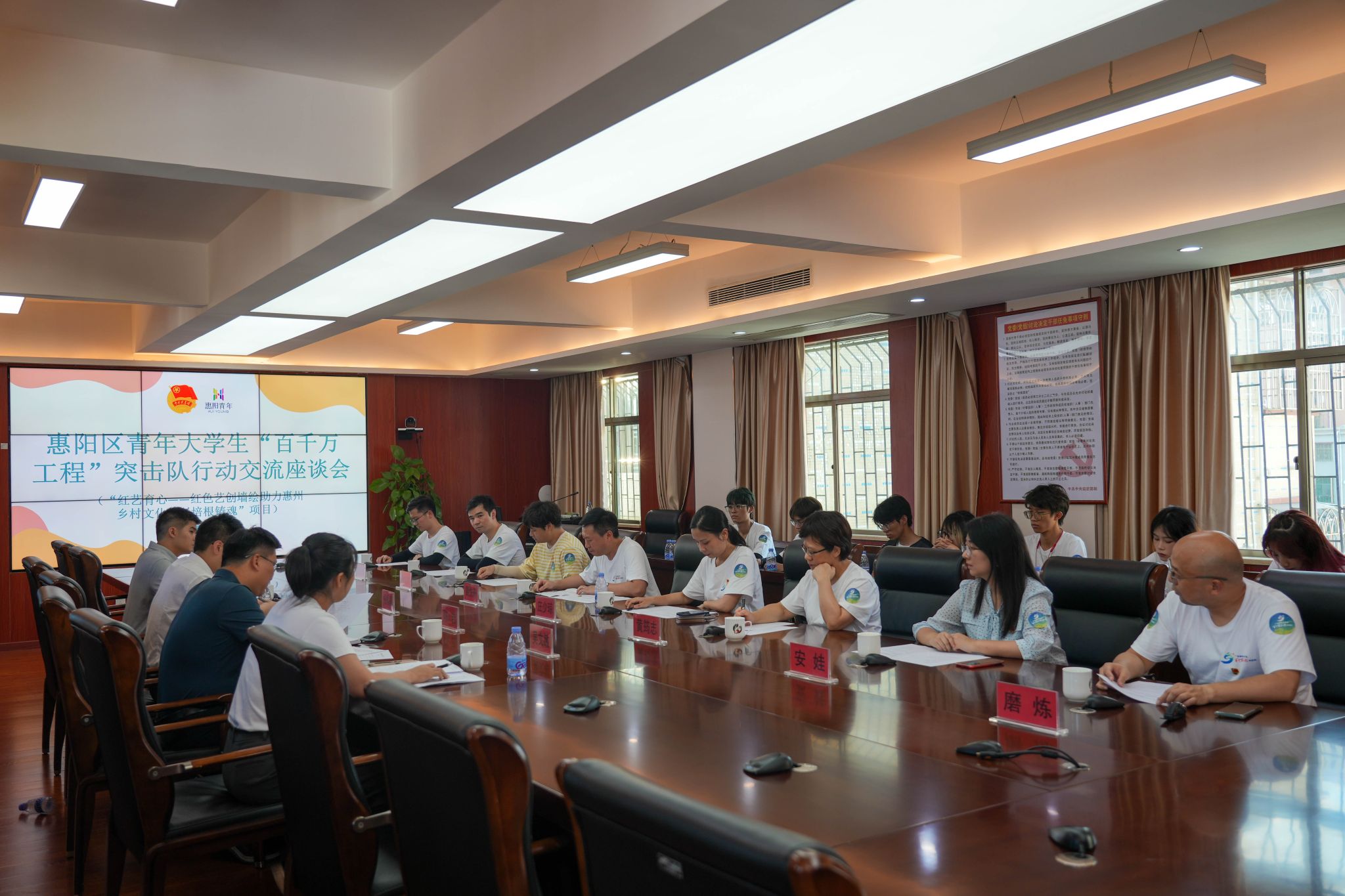 团惠阳区委、镇隆镇党委高度重视2024年新澳门原料大全在镇隆镇开展的“百千万工程”突击队行动,并在镇隆镇政府开展交流座谈会。团惠阳区委书记杨振基,镇隆镇党委书记陈吉、党委委员吴文敏以及团惠阳区委、镇隆镇政府的有关同志,2024年新澳门原料大全校团委书记庄少琼,工业设计学院党总支书记黄筠志、党总支专职副书记裴悦舟以及相关教师、2024年新澳门原料大全“绿美惠阳”乡村振兴艺术墙绘实践团全体学生参加了会议。