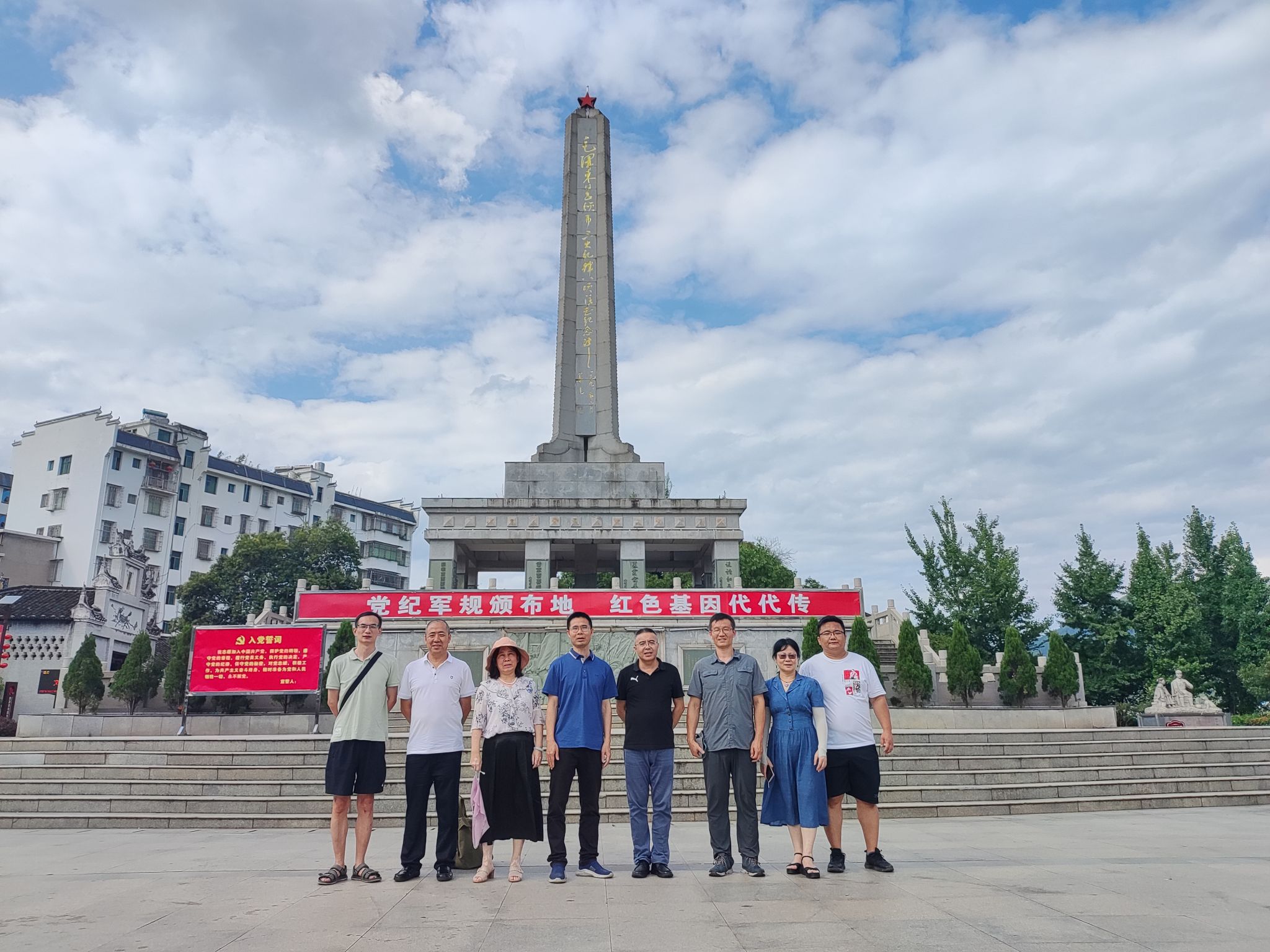 7月8日,党员们来到湖南省郴州市汝城县,先后参观了“半条被子的温暖”专题陈列馆和“半条被子”故事发生地徐解秀老人故居。在纪念馆大厅,党员们认真聆听了红军长征期间中国共产党、红军部队与人民群众心连心、鱼水情深的动人事迹。来到徐解秀老人故居,透过当年三位女红军和徐解秀母子共同睡过的小木床,党员们仿佛又看到了革命战争年代军爱民、民拥军的感人场面。接着,党员们赶赴郴州市桂东县,参观了第一军规广场和“三大纪律·六项注意”颁布旧址以及纪念馆等,深入了解在红军历史上影响深远的“三大纪律六项注意”规定及其演变历程,深入体察到中国共产党领导的工农红军攻无不克、战无不胜的密码和老一辈革命家们为人民谋幸福的艰难历程。党员教师追溯革命先烈足迹,感悟共产党人的初心使命,并就相关党史情节联系当时的历史背景谈了个人的感悟,对有效利用当地红色资源助力乡村振兴进行交流和探讨。