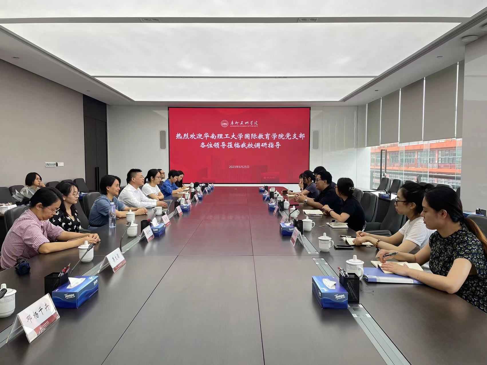 会上,双方就深入推进教育对外开放进行了探讨。我校国际合作与交流处党支部书记、处长伍端介绍了我校近年来推进高等美术教育国际化方面的经验,就佛山校区国际化建设、办学体制创新、讲好留学广美故事等方面进行了分享。华南理工大学国际教育学院党支部书记王庆年介绍了华南理工大学推动在地国际化方面的成熟经验,分享了其在引进国际化师资、推动国际化学术治理、创设沉浸式学术社区等方面的具体举措。