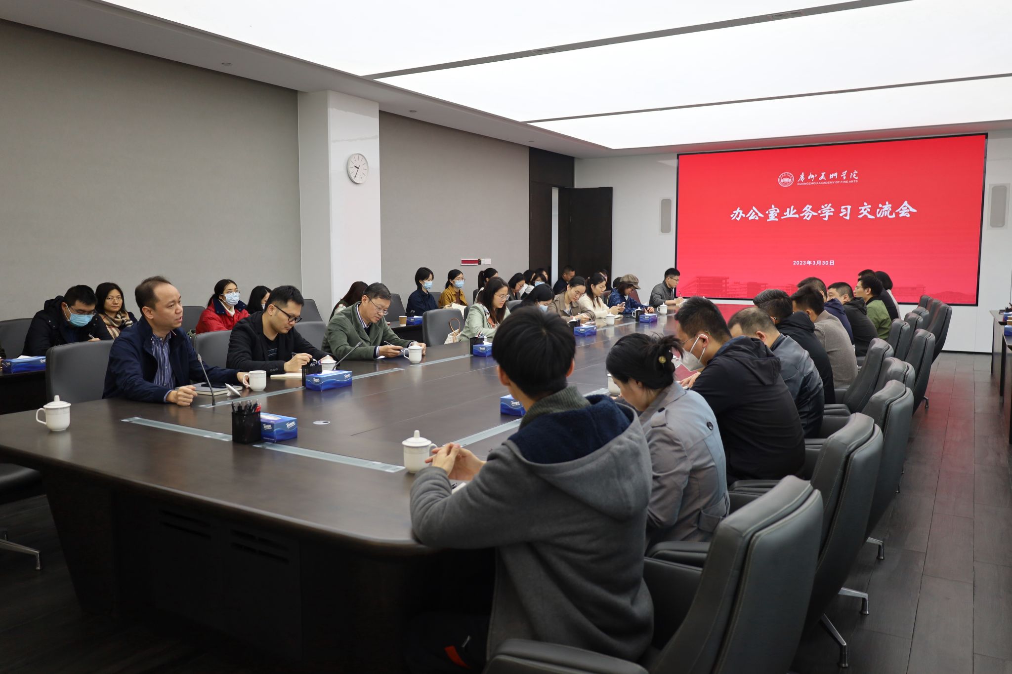 为增进学校各行政单位人员业务交流,增强行政人员法治意识,全面规范办事流程,3月30日上午,学校在大学城校区举行全校办公室行政工作学习交流会,党政办、各二级学院办公室主任、各部门办公系统经办人员参加会议。会议由党政办主任林丰主持。