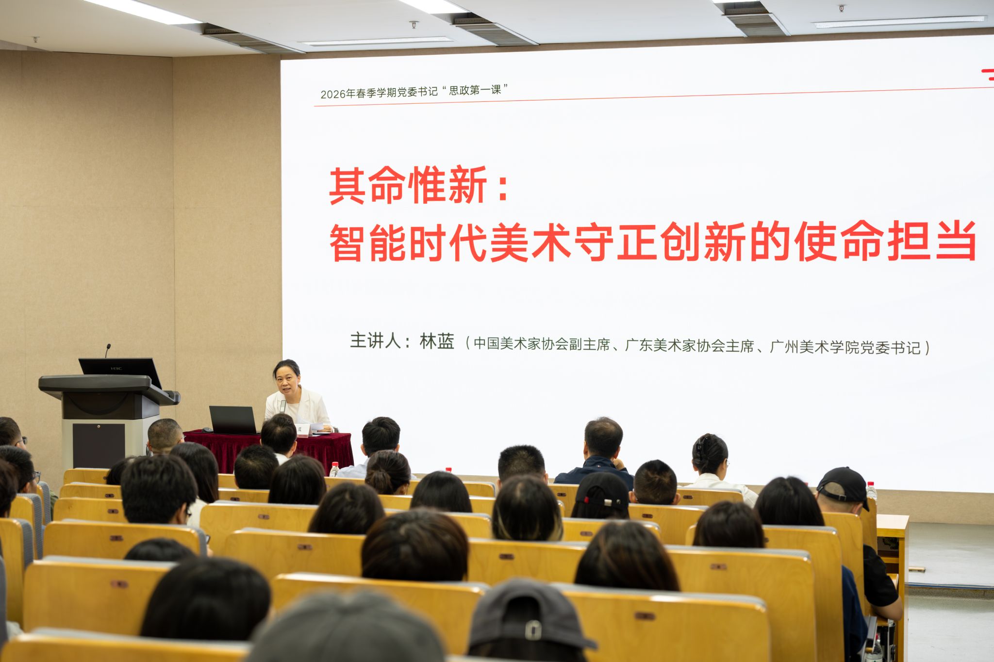 4月1日上午,学校党委书记林蓝教授以“其命惟新:智能时代美术守正创新的使命担当”为题,为学生讲授春季学期“思政第一课”。学校教职工代表、各学院辅导员、马克思主义学院全体教师现场聆听学习,马克思主义学院院长徐平华主持。