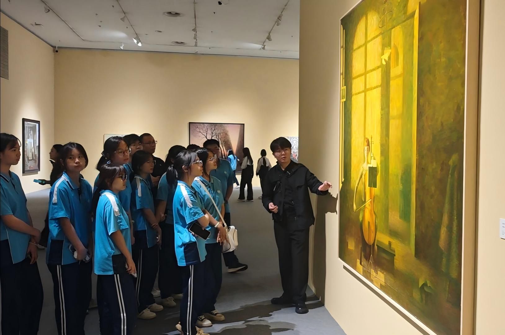 随后,大家前往大学城美术馆参观列宾美术学院优秀作品展,展览汇聚了世界知名美术学府的经典佳作,涵盖油画、素描、版画等多种艺术形式,充分展现了列宾美术学院严谨的造型功底与深厚的古典现实主义传统。研学团一行分为四组,由我校附中四位专业教师现场分组观展导览。期间,老师们结合展出作品的创作背景与艺术风格,用通俗易懂的方式从构图法则、色彩运用、笔触表现等角度进行细致讲解。同学们时而凑近观察笔触的肌理,时而退后品味整体的构图,现场互动频繁,学习氛围浓厚,在近一个半小时的观展过程中加深了对艺术的理解。