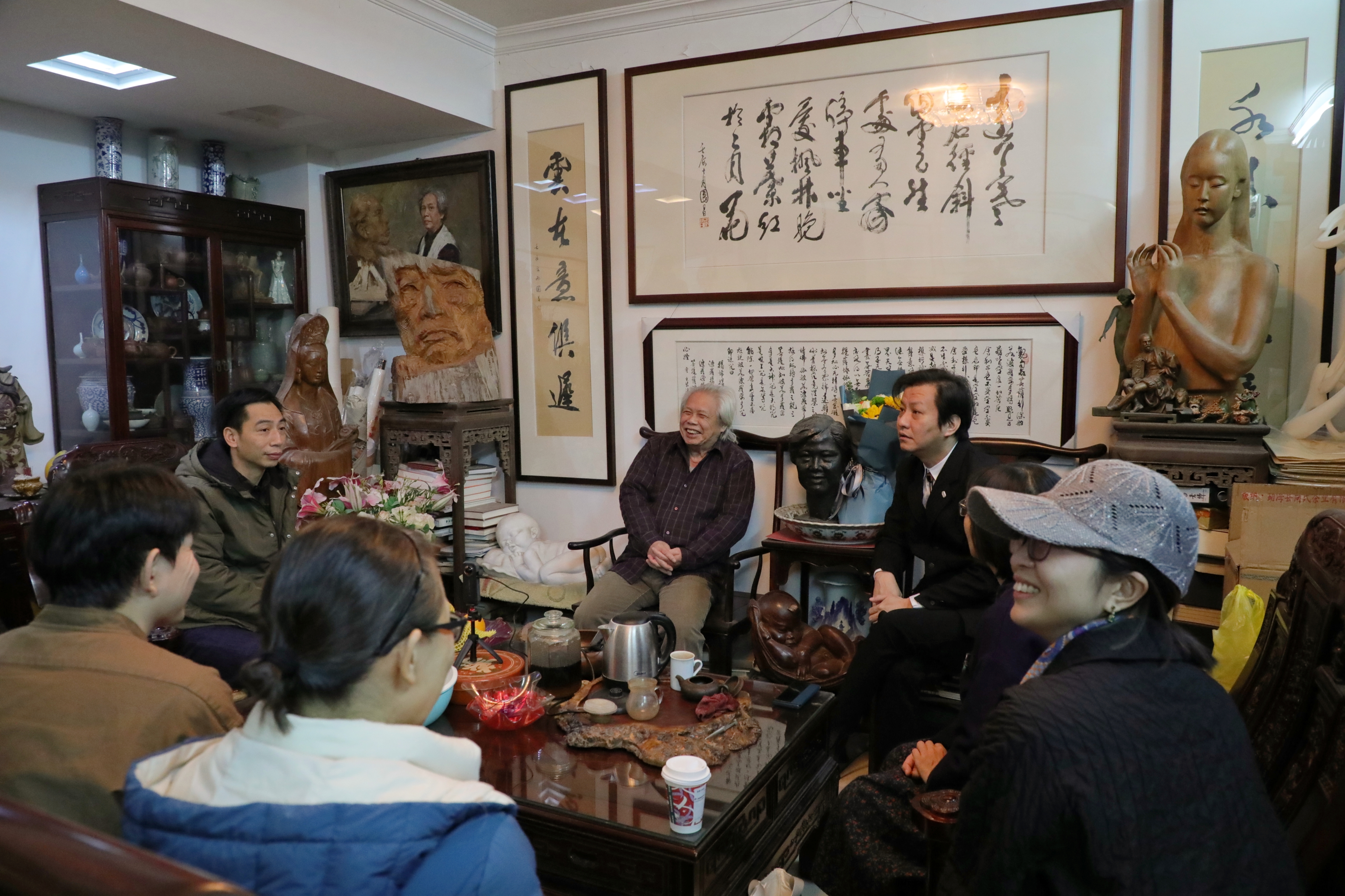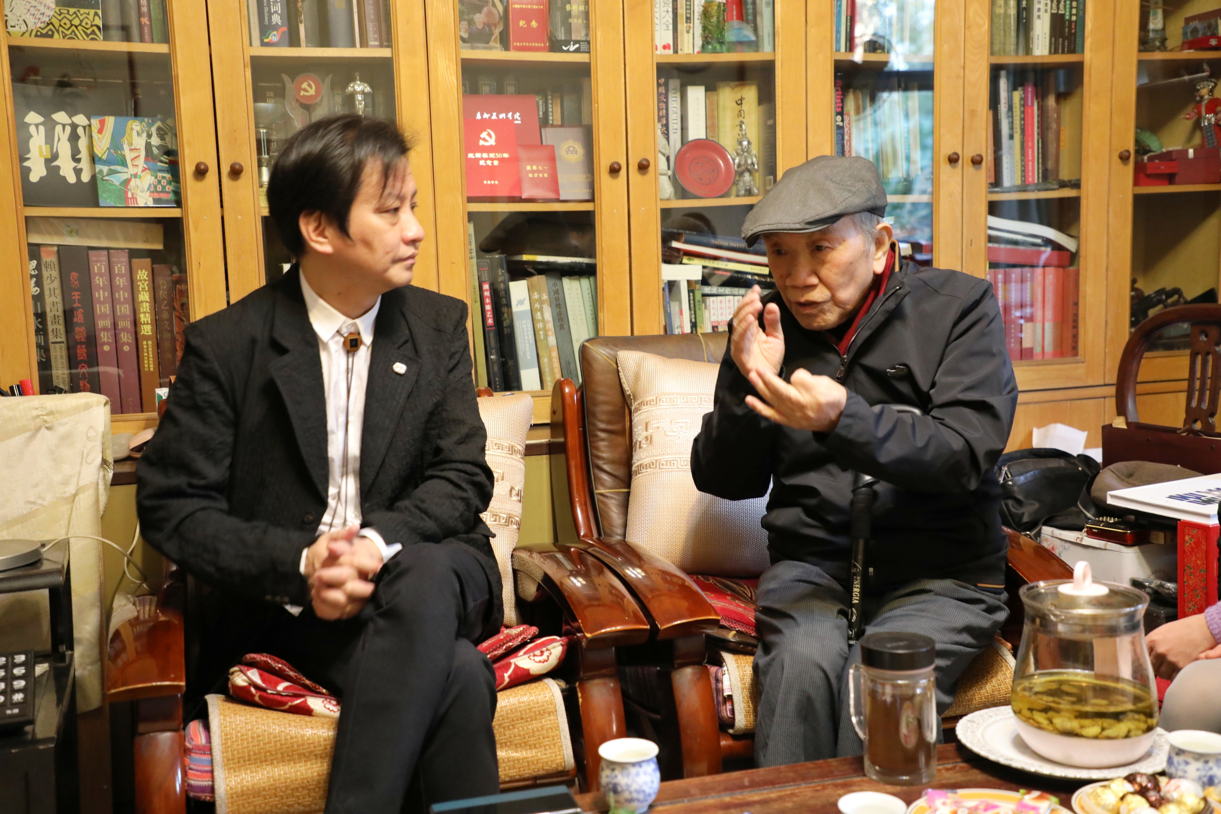 齐喆一行和老教授们亲切交谈,关切询问他们的身体、生活状况,向他们详细汇报了学院近年来的发展及取得的成绩,对他们多年来潜心创作、乐育英才深表敬意,并向他们送上学院毕业作品集、毕业创作衍生品等。两位老教授和大家一起回顾了学院的发展历史,分享了自己从艺从教几十载的感悟,对专业发展和规划提出了建议,他们表示将一如既往关心支持学院各项工作,继续为学院发展贡献力量。