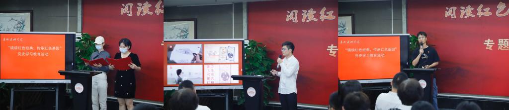 绘画艺术学院党总支学生党员林泽伟、周甜甜以“在土地革命战争时期的中央苏区货币”为主题,分享了创作南方+全媒体节目《青春红图志》的历程,以青年人的视觉,解读中国共产党早期金融起步发展的历史。雕塑与公共艺术学院党总支学生党员古世豪朗诵了毛泽东的词——《沁园春·雪》。